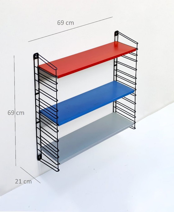Met zijn levendige kleuren en strakke lijnen voegt dit rek een vleugje retro charme toe aan elke ruimte. De combinatie van rode, blauwe en grijze planken met een zwart metalen frame maakt het een opvallend stuk dat zowel functioneel als stijlvol is. Perfect voor het tentoonstellen van boeken, kunstobjecten of planten, dit rek biedt veelzijdigheid en esthetiek. Voeg een stukje designgeschiedenis toe aan uw interieur met dit prachtige wandrek.