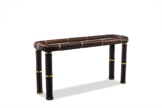 Rechthoekige consoletafel van bordeauxrood keramiek versierd met touwen en verguld messing. Bovenblad in gerookte spiegel omringd door verguld messing.