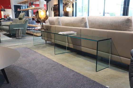 Tonelli Design Capo Horn sidetable De Capo Horn is een minimalistische console vervaardigd uit glas, met een heldere structuur en een subtiele lichtgroene tint. De verbindingen zijn UV-verlijmd, wat resulteert in een naadloze afwerking en een robuuste constructie. Met een diepte van 35 cm biedt de console voldoende ruimte voor het plaatsen van een tafellamp achter de bank of het tijdelijk achterlaten van uw boek en koffie. Dit showroommodel heeft een breedte van 250 cm en een hoogte van 52 cm. De console is geschikt voor plaatsing achter de bank, maar ook als wandmeubel in een hal of woonkamer. * Materiaal: Helder glas, UV verlijmd * Afmeting: B250 x D35 x H52 cm * Deze console kan niet gedemonteerd worden. Bij voorkeur plaatsen op de begaande grond. * Onderhoudsvriendelijk