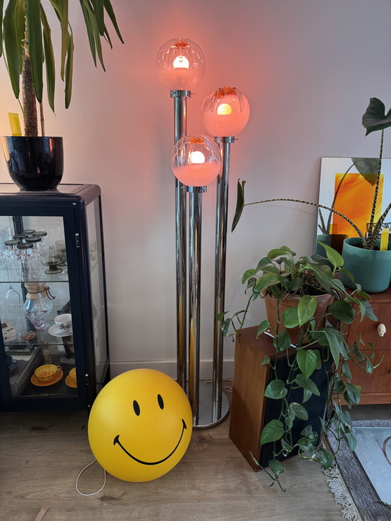 Breng een vleugje vintage flair in je interieur met deze prachtige vloerlamp van Toni Zuccheri voor Mazzega. Deze lamp is een echte blikvanger met zijn unieke glazen bollen en stijlvolle metalen afwerking. Perfect voor in de woonkamer of als statement piece in de hal.