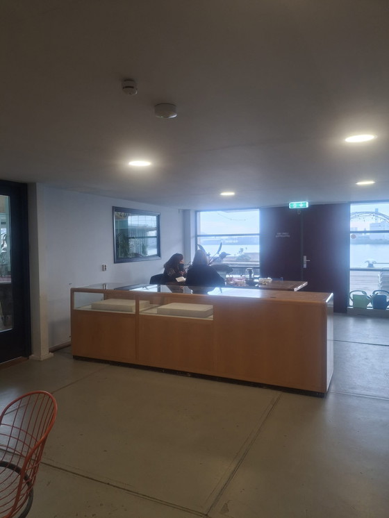 Mooie en robuuste toonbank vitrine. De vitrine is in goede staat, maar er zijn wat gebruikssporen. Er is een gat in bovenblad (handig voor stroomkabel o.i.d.) en er zijn wat krassen in get glas. De kast is zwaar en is één geheel/kan niet uit elkaar.