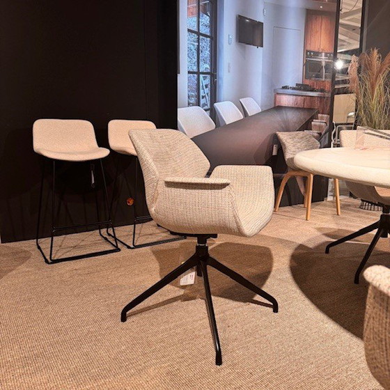 Tooon Draaibare Armstoel – Luxe Comfort in Perfect Vakmanschap Set van 6 – Gestoffeerd in Fiesta Stof, Kleur 22 Vapour – Zwart Onderstel Ervaar het ultieme zitcomfort met de Tooon draaibare armstoel, een verfijnde mix van design, functionaliteit en ambacht. Deze set van 6 stoelen is bekleed met de exclusieve Fiesta stof in de elegante kleur 22 Vapour – een subtiele, moderne tint die moeiteloos in elk interieur past. Elke stoel is met uiterste precisie en vakmanschap gestoffeerd. De fijne afwerking, strakke naden en perfect aansluitende bekleding getuigen van het oog voor detail waarmee deze stoel is vervaardigd. De hoogwaardige Fiesta stof voelt niet alleen luxe aan, maar is ook slijtvast en comfortabel, ideaal voor dagelijks gebruik. Het zwarte draaibare onderstel zorgt voor een moderne uitstraling en verhoogt het gebruiksgemak, waardoor deze stoel niet alleen een lust voor het oog is, maar ook bijzonder functioneel in gebruik. Of u nu gasten ontvangt aan de eettafel of een stijlvolle vergaderopstelling wilt creëren – met deze set van zes Tooon armstoelen haalt u topkwaliteit, comfort en vakmanschap in huis. bezorging niet inbegrepen