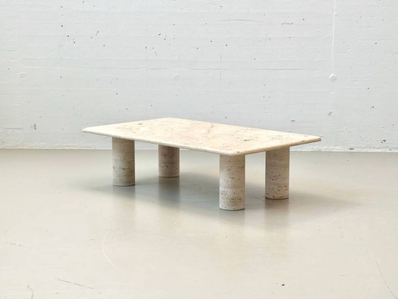 Deze rechthoekige salontafel van licht travertijn is ontworpen door Angelo Mangiarotti voor de Italiaanse fabrikant Up & Up.