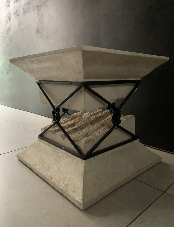 Travertin en ijzeren sokkeltafel met "gebroken" ontwerp