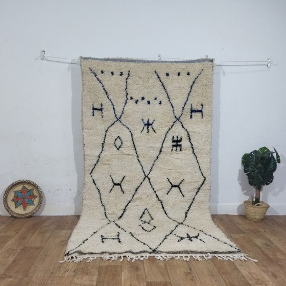 Breng authentiek karakter en tijdloze elegantie in je huis met dit handgemaakte Marokkaanse Berbertapijt. Het tapijt heeft een zachte crèmekleurige wollen basis met traditionele zwarte Berbersymbolen en geometrische lijnen, wat zorgt voor een prachtig tribaal design met culturele betekenis en minimalistische charme.