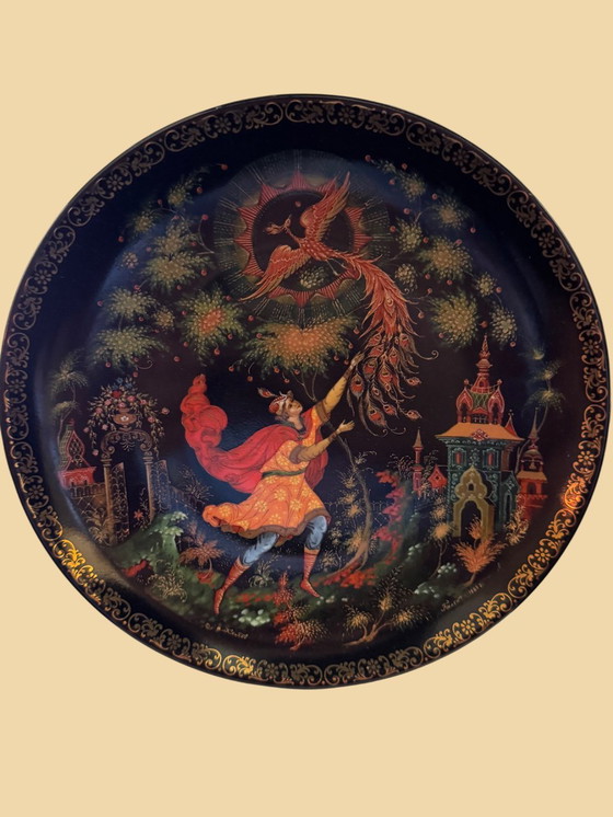 Een buitengewoon prachtig collector bord uit de serie "Zhar-Ptitsa" (De Vuurvogel), vervaardigd door de Lomonosov Porcelain Factory in Sint-Petersburg — opgericht in 1744 in opdracht van keizerin Elizabeth. Dit is het eerste bord uit de serie, geschilderd door de getalenteerde Palekh kunstenaar Alexander Klykov.