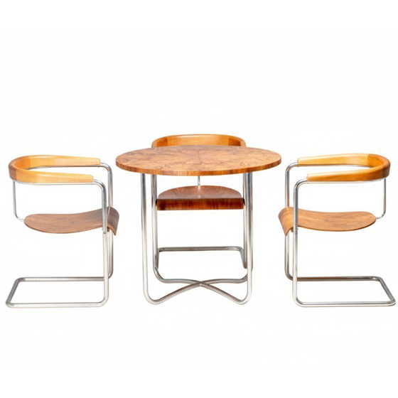 Een verfijnde Tsjechoslowaakse functionalistische eethoek, bestaande uit drie fauteuils en een ronde tafel, toegeschreven aan de kring rond Jindřich Halabala en geproduceerd in Tsjechoslowakije tussen eind jaren 30 en begin jaren 40.