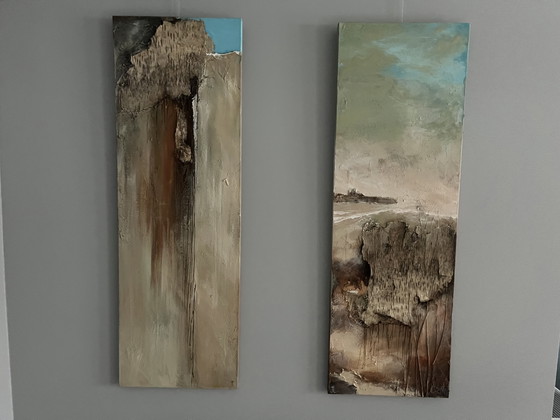 Dompel jezelf onder in de fascinerende wereld van abstracte kunst met dit paar opvallende schilderijen, elk met een indrukwekkende afmeting van 190 cm bij 40 cm. Deze werken nodigen je uit om hun textuurrijke landschappen te verkennen, waar aardse bruintinten en zachte beiges worden afgewisseld met vleugjes levendig blauw, wat een dynamische visuele ervaring creëert.