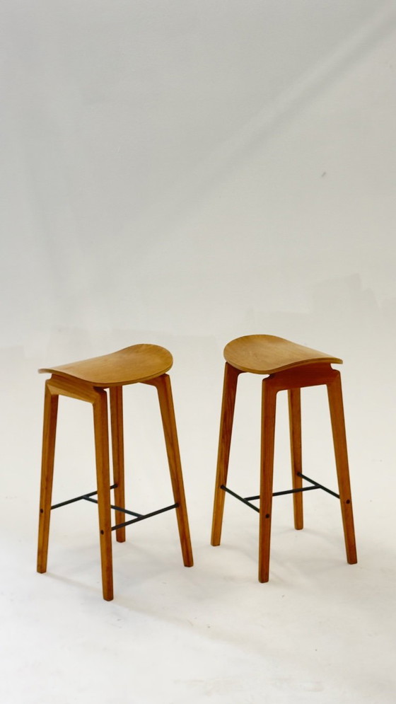 Deze twee barkrukken met een hoogte van 64cm passen perfect bij een verhoogd keuken eiland of een bar tafel. Er zijn geen zichtbare tekens van gebruik daar deze heel weinig gebruikt zijn geweest.