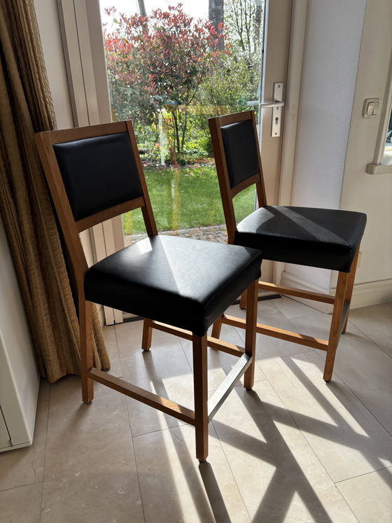 Deze set van twee barkrukken van Jan des Bouvrie straalt moderne elegantie uit en is een prachtige aanvulling voor elke keuken of bar. De combinatie van zwart leer en warm hout zorgt voor een tijdloze uitstraling die zowel stijlvol als functioneel is. De zithoogte is 63 cm.