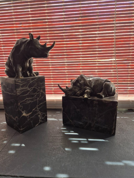 De bronzen neushoorns staat op een natuurstenen bruin geaderde sokkel en de hoogte van sokkel plus beeld zijn ca: 23 cm. voor de zittende neushoorn en ca: 15 cm. voor de liggende neushoorn. 5250 gram.