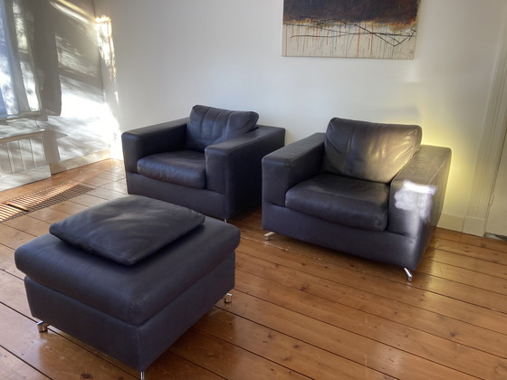 Set van twee donkerblauwe leren fauteuils inclusief bijpassende poef met los kussen, van het merk Machalke & Machalke. Weinig gebruikt, geen beschadigingen of slijtage.