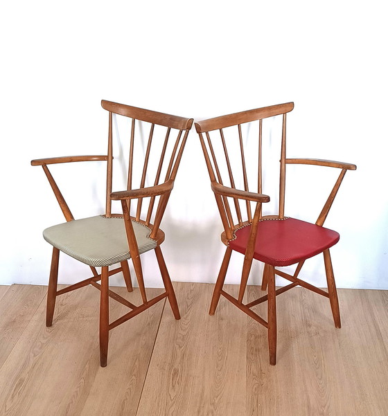 Twee stijlvolle vijftiger jaren stoelen met armleuning. Alle houten delen zijn taps toe en aflopend. Dat was vroeger al veel werk, maar het geeft een prachtige speelse uitstraling aan de stoelen. Door de jaren heen hebben ze behoorlijk wat vintage slijtage ondergaan maar zijn nog steeds in goede staat. Conditie zie foto's.