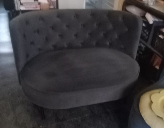 Diepgrijs tweezits bankje met gecapitonneerde ietwat rondgevormde rugleuning. De stof is velours. Door gewijzigde omstandigheden is het bankje overcompleet geworden. (115 CM breedte/hoogte vd zitting 37 cm/hoogte van de rugleuning 75 cm/zitdiepte 60 cm.