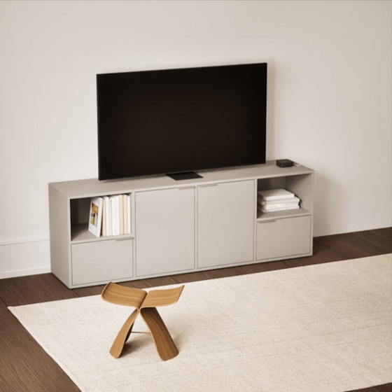 Een prachtig, nieuw en modern grijs tv-meubel met deuren, in de originele verpakking.