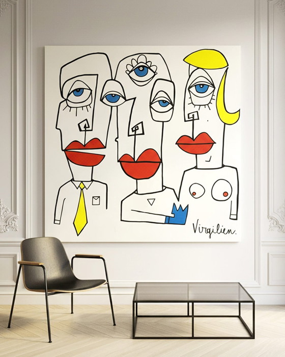 Graffiti, theater en fotografie leiden Virgilien door de kunst. Niet zo naïef! Zeldzaam groot schilderij op canvas van 200x200 cm, getiteld en gesigneerd door de kunstenaar: Challenge, Virgilien 2016. In perfecte staat.