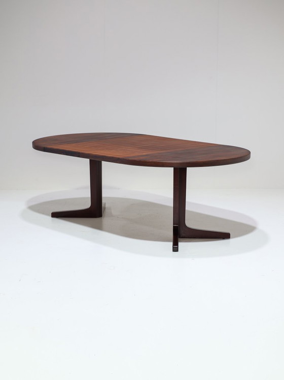 Prachtige uitschuifbare eettafel uit Denemarken, jaren '60. Deze mid-century tafel met x-poot / kruispoot is gemaakt van palissanderhout (deels fineer en deels massief) met een mooie rijke houttekening. Rond is de tafel geschikt voor 4 personen. De tafel is met één tot twee extra bladen te verlengen, waarmee je hem eenvoudig omtovert tot een 6- of 8- persoons ovale eettafel. Een tijdloos, stijlvol én zeer praktisch design.
