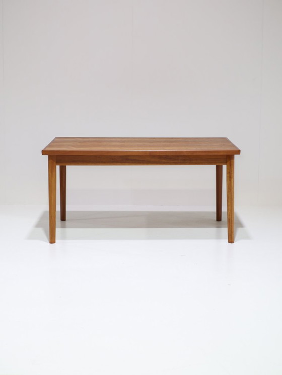 Prachtige rechthoekige uitschuifbare eettafel uit Denemarken, jaren '60. Vermoedelijk geproduceerd door Glostrup Møbelfabrik. Deze vintage tafel van hoge kwaliteit is gemaakt van teakhout en heeft een minimalistische vormgeving met verfijnde details in de poten en randen. De tafel bevat twee verlengstukken, welke onder het tafelblad vandaan getrokken kunnen worden.