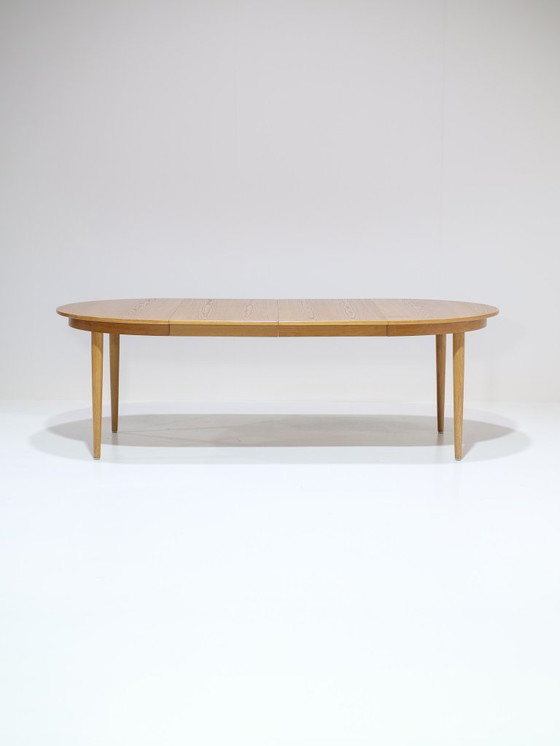 Prachtige uitschuifbare eettafel geproduceerd door Skovmand & Andersen in Denemarken in de jaren '60. Deze eikenhouten mid-century tafel is rond geschikt als 4-persoons eettafel. Doordat de tafel met een tot twee extra bladen te verlengen is, tover je de tafel eenvoudig om tot een 6-persoons of 8-persoons ovale eettafel. Een kwalitatief, praktisch, stijlvol én tijdloos design.