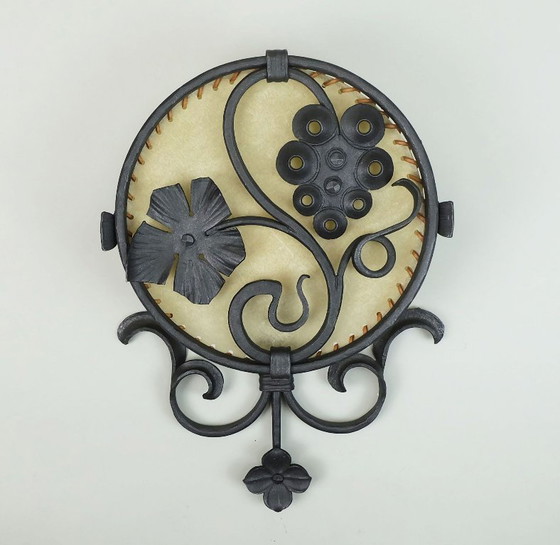 uitstekende 1970 vintage wandlamp smeedijzer en perkament koch & sons brutalistisch rustiek ontwerp