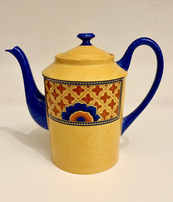 - De theepot heeft een levendige gele kleur, versierd met ingewikkelde rode en blauwe motieven, die de rijke Art Deco-stijl weerspiegelen.