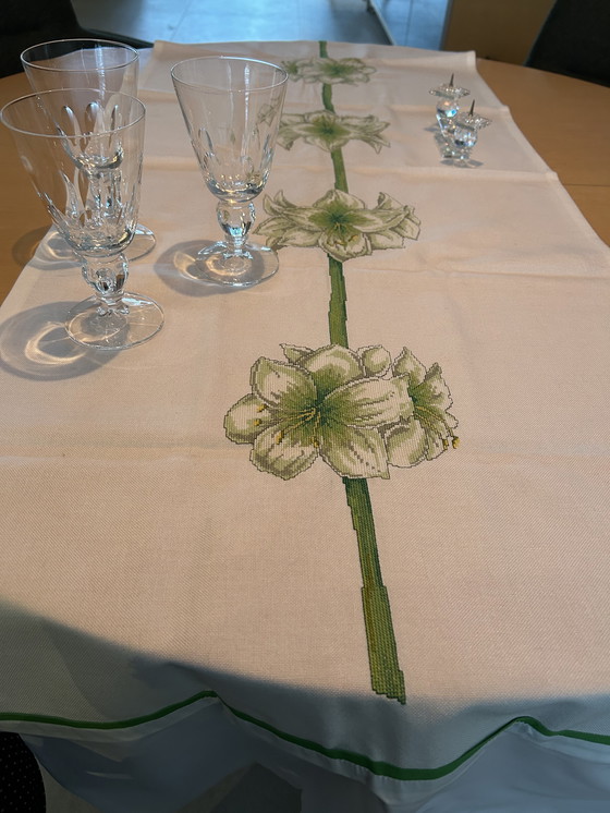 Handgeborduurd tafelkleed in zachte groentinten met een patroon van bloeiende witte amaryllis. Heel mooie kwaliteit van stof en garens. Zeer fijn borduurwerk. Nog in prachtige staat, weinig gebruikt.