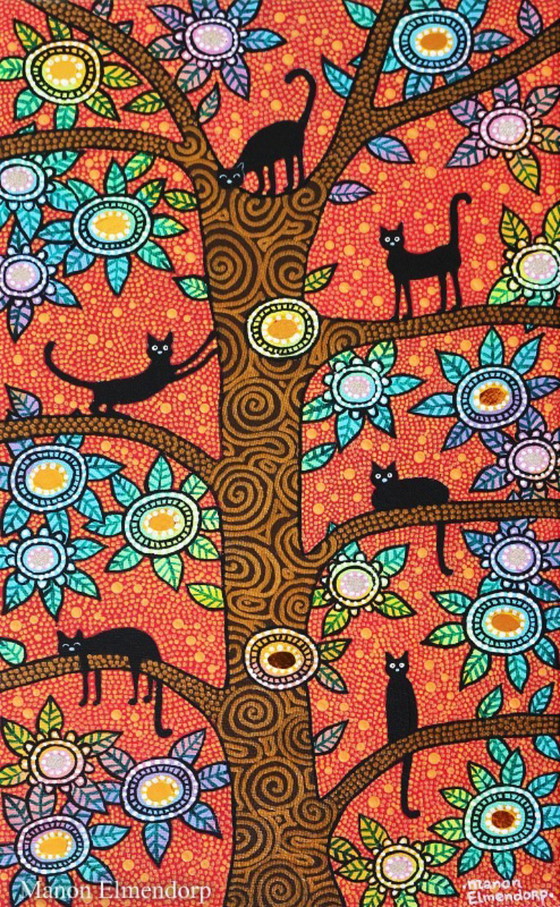 Uniek Handgeschilderd Schilderijtje Katten in Boom 30x18 cm