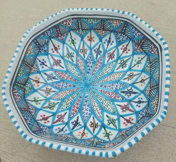 Deze handgemaakte en handgeschilderde schaal uit Nabeul, Tunesië heeft een prachtig traditioneel geometrisch motief en is in zeer goede staat.