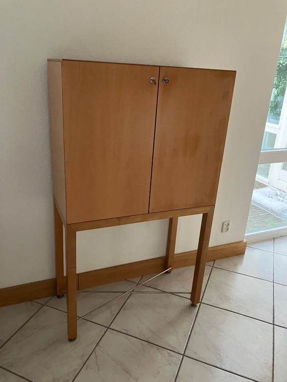 Deze elegante houten kast combineert een tijdloos ontwerp met een lichte, verfijnde uitstraling. Het strakke front met twee deuren wordt gedragen door slanke poten, waardoor de kast luchtig oogt en de ruimte eromheen open blijft. De subtiele metalen kruisverbinding onderin voegt niet alleen stabiliteit toe, maar geeft het meubel ook een karakteristiek, modern accent.