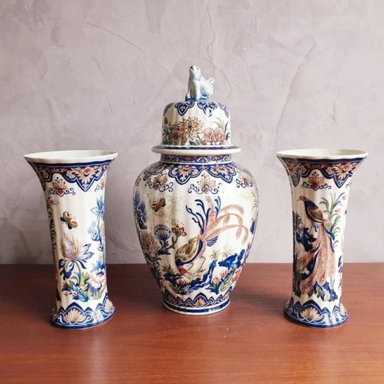 Grote vintage polychrome vaas met deksel en blauwe hond bovenop met 2 bloemenvazen.