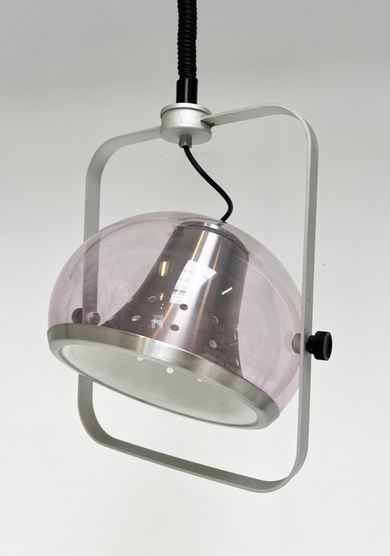 Verstelbare kunststof met aluminium lamp van Dijkstra uit de 1960’s. Een uniek ontwerp van Nederlands fabricaat in Space Age-stijl. Met werkende pendel. De lamp heeft een diameter van 27 cm en is 40 cm hoog. Totale hoogte met kabel is 150 cm. In werkende staat met lichte gebruikerssporen conform leeftijd.