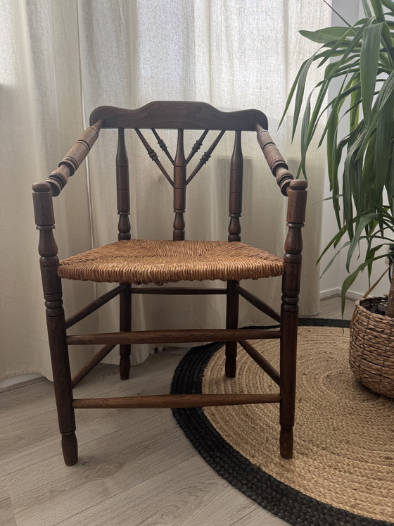 Op slag verliefd? Deze prachtige vintage stoel is dé match voor jouw minimalistische paleisje. Met zijn warme, donkere hout en handgeweven biezen zitting brengt hij direct die heerlijke serene sfeer in huis.