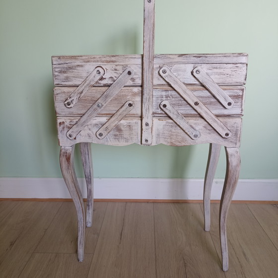 Wat dit exemplaar uniek maakt, is de indrukwekkende spanwijdte van maar liefst 153 cm wanneer deze volledig is uitgeklapt. Met vijf ruime compartimenten biedt de kist een zee aan opbergruimte voor fournituren, sieraden of andere verzamelingen.