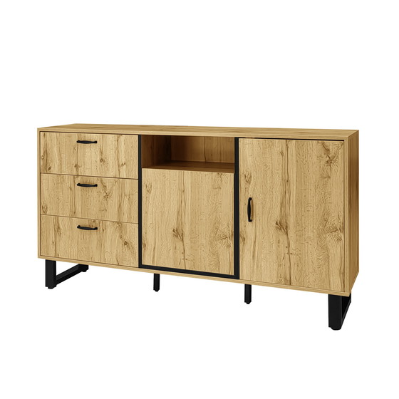 Het algehele ontwerp maakt gebruik van een combinatie van hout en zwart die een modern en gelaagd gevoel geeft, waardoor het meubel een eenvoudige maar niet monotone uitstraling krijgt. Door het gebruik van hoogwaardige materialen en duurzaam beslag is het dressoir slijtvast, gaat het lang mee en kan het aangepast worden aan de eisen van dagelijks gebruik. Dit dressoir maakt niet alleen indruk met zijn functionaliteit, maar voegt ook stijl en elegantie toe aan je huis, waardoor het ideaal is voor je woonkamer, eetkamer of slaapkamer.
