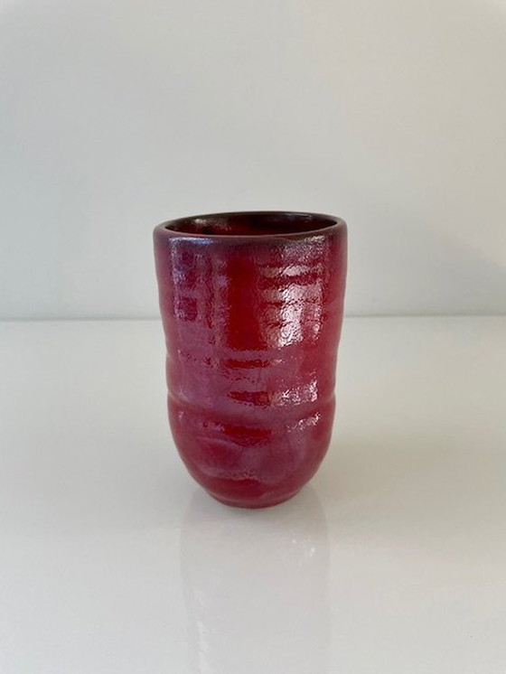 Moderne Design vaas "Magenta" van de kunstenaars van "Des Pots". Prachtig gemeleerd rood geglazuurd keramiek. Afmetingen: Ø7,5cm en 12cm. In zeer goede staat!