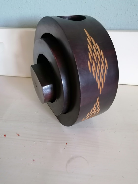Deze set van drie Japanse vazen is een prachtig voorbeeld van vakmanschap en design. De vazen zijn zo ontworpen dat ze in elkaar kunnen schuiven, wat niet alleen ruimtebesparend is, maar ook een uniek visueel effect creëert. Gemaakt van hoogwaardig hout, stralen ze een warme bruine tint uit met een subtiel ingelegd patroon dat een vleugje elegantie toevoegt. Perfect voor het tentoonstellen van bloemen of als decoratief object op zichzelf, deze vazen voegen een vleugje Aziatische stijl toe aan elk interieur.