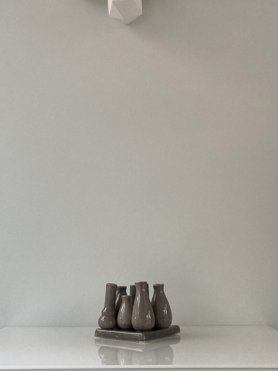 Deze moderne vaasjesset bestaat uit meerdere kleine vaasjes die op een vierkante ondergrond zijn geplaatst. Ze zijn gemaakt van keramiek en hebben een stijlvolle grijze kleur. Perfect voor het decoreren van een tafel of plank, deze vaasjes voegen een eigentijdse flair toe aan elk interieur.