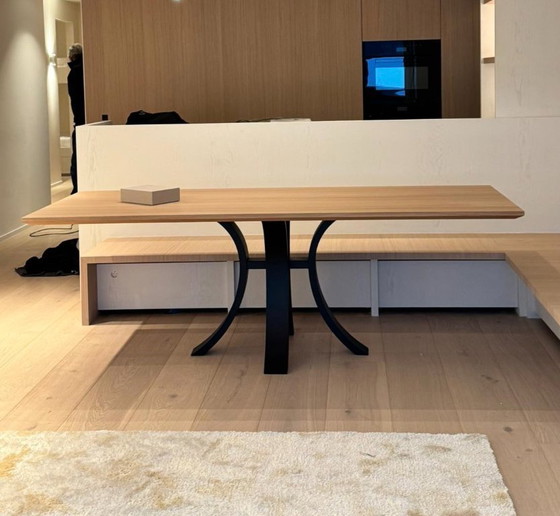 De tafel is uitzonderlijk stevig en hoogwaardig afgewerkt, met een strak en elegant design dat moeiteloos past in zowel moderne als meer ingetogen interieurs. Dankzij de doordachte vorm van de poot is deze tafel bijzonder geschikt in combinatie met een eetbank: er blijft voldoende beenruimte om comfortabel aan te schuiven.