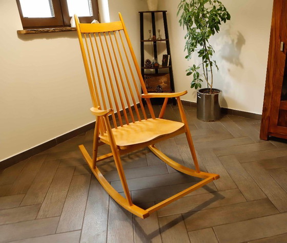 Deze elegante schommelstoel, in 1969 gemaakt door de Finse maker Varjosen Puunjalostus in Uusikylä, weerspiegelt de strakke lijnen en gratie van Scandinavisch design. De stoel heeft een hoge rugleuning met latten en een zacht gebogen zitting en verkeert in originele, goed geconserveerde staat met minimale gebruikssporen. Een perfect stuk voor een leeshoek of als stijlvol interieurstatement.