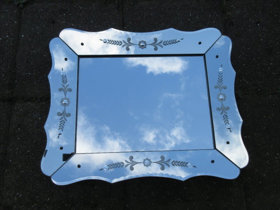 Antieke Venetiaanse spiegel in zeer goede staat brocante jaren `50. . De spiegel is voor zijn leeftijd in een zeldzaam mooie staat. Afmetingen: l x b x d = 81,5 x 66,5 x 6 cm.