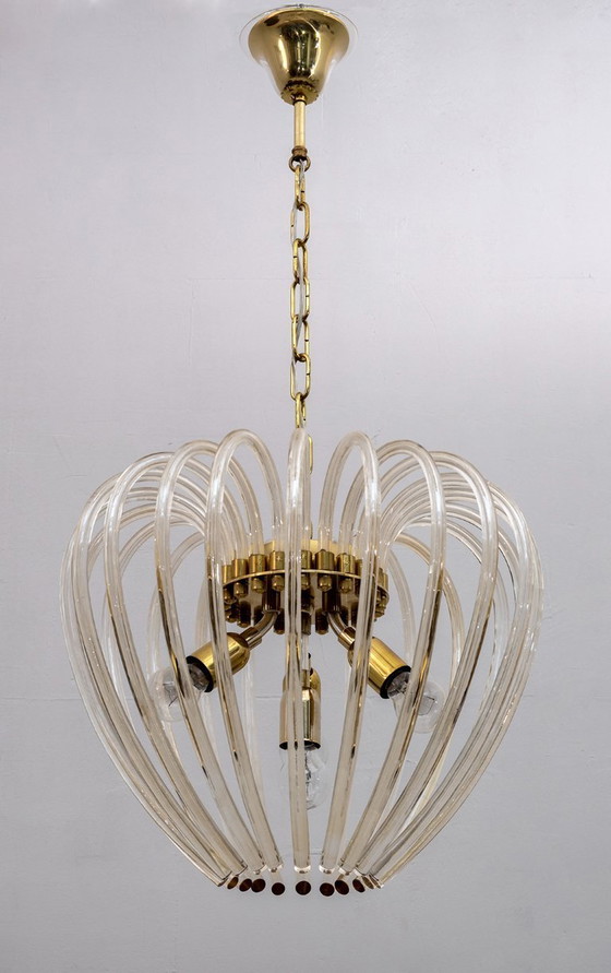 Venini Mid Century Moderne Italiaanse kroonluchter van Murano glas en messing, 1950