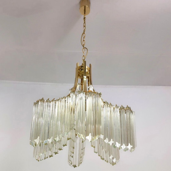 Indrukwekkende vintage hanglamp uitgevoerd in helder Murano glas met lange, slanke glazen elementen die in lagen zijn opgebouwd. De lamp heeft een elegante, architectonische vorm met een sterke verticale lijnwerking.