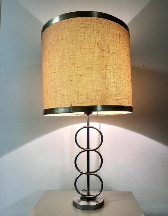 Vintage chromen lampenvoet, jaren 1970. Verzilverd metaal. Schade aan lampenkap te vervangen. Wordt geëlektrificeerd. 100% origineel. Afmetingen : Diameter voet: 13 cm Hoogte: 41 cm