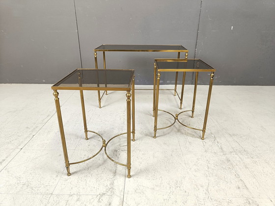 Neoklassieke salontafelset bestaande uit drie tafels met een verguld metalen frame en bladen van rookglas in de stijl van Maison Jansen. Speels ontwerp met het gebogen metaal tussen de poten. 1960 - Frankrijk Goede staat Afmetingen: Hoogte: 49cm Breedte: 70cm Diepte: 34cm Afmetingen kleinere tafels: 45x31x31cm Ref.: 25011507 *Alle afbeeldingen zijn altijd onderdeel van de beschrijving.