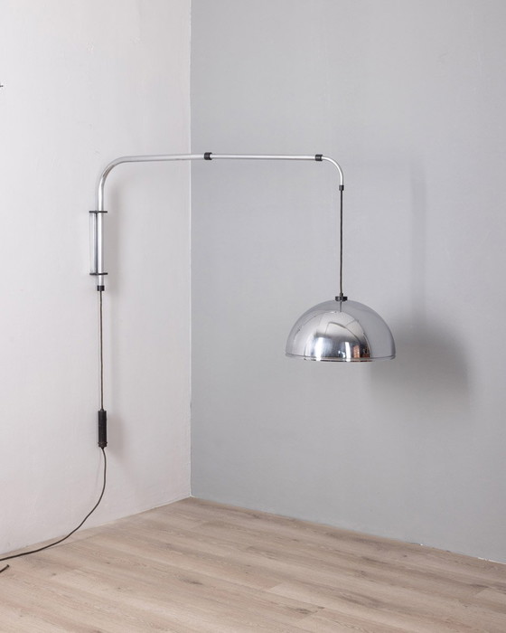 Wandlamp van verchroomd metaal, verstelbaar in breedte en hoogte via het contragewicht waarin de schakelaar zich bevindt, Italiaans ontwerp, jaren 70.