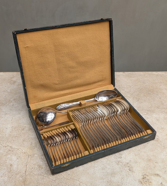 Ai; Deze verzilverde Art Deco bestekset straalt een tijdloze elegantie uit die uw dinertafel naar een hoger niveau tilt. De set is zorgvuldig vervaardigd met een verfijnde afwerking die de kenmerkende geometrische patronen van de Art Deco-stijl prachtig tot uitdrukking brengt.