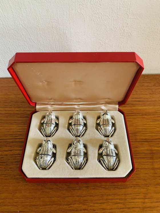 Fantastische set van 6 vintage messensteunen/meshouders/naamkaartjeshouders in de vorm van een kikker, uit het midden van de vorige eeuw, afkomstig uit Frankrijk, circa jaren 50-60. De onderdelen zijn gemaakt van metaal met een verzilverde coating en hebben een mooi, elegant ontwerp, met een smalle gleuf aan de achterkant waarin dinermessen geplaatst kunnen worden, of die gebruikt kan worden als plaatskaarthouders voor diners, chique diners, speciale gelegenheden, bruiloften, enz. (zie foto's). De set wordt geleverd met de originele, karmozijnrode doos van skai/kunstleer (zie foto's). De binnenkant van de doos heeft een fluweelachtig, crèmekleurig gedeelte met aparte vakjes voor elk mesje, en de bovenkant is bekleed met een satijnachtig, licht koperkleurig materiaal dat is gewatteerd om elk onderdeel te beschermen wanneer de doos gesloten is (zie foto's). De set verkeert over het algemeen in goede, originele en vintage staat, met enkele lichte gebruikssporen en een patina op de structuren en voetstukken, zoals te verwachten is gezien de leeftijd (zie foto's). De doos zelf is nog in zeer goede, originele staat. Het heeft zijn rijke kleur behouden, met minimale tekenen van ouderdom en gebruik, een mooie patina en opent en sluit soepel. Geen scheuren of gaten. Het is slechts licht afgestoft, waardoor de oorspronkelijke patina behouden is gebleven (zie foto's). Alle foto's zijn binnenshuis genomen bij natuurlijk licht, waardoor de kleuren kunnen variëren afhankelijk van de helderheid, reflecties, schaduwen, hoek en perspectief. Werkelijke afmetingen van de doos: H: 2,5 cm x B: 14,5 cm x D: 11 cm | Afmetingen van elk messenhoudertje: