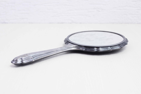 Mooi handspiegeltje uit de jaren 30/40 Voor in je huis, handtas of badkamer, dit spiegeltje zal snel zijn plaats en zijn nut vinden! Hij komt uit een overgangsperiode en heeft een mooi Art Deco, Art Nouveau ontwerp. Licht afgeschuinde spiegel. Afmetingen: Hoogte 30cm Breedte 15cm Diepte 2cm Vintage item met wat ouderdomssporen, oxidatie van het zilver en kleine krasjes op de achterkant. De spiegel is goed bewaard gebleven en perfect functioneel. Aarzel niet om contact met me op te nemen via e-mail als je vragen hebt of extra foto's wilt.