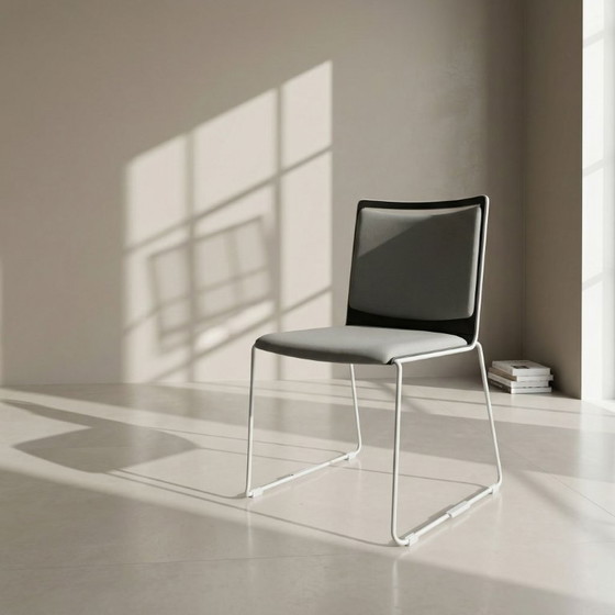Hoogwaardige designstoel van Viasit. Zo goed als nieuw, geen gebruikssporen. Viasit Klikit met sledevoet, verbindingsstukken, zwarte kuip, zilverkleurig frame, viltglijders en gestoffeerde zitting en rugleuning. Premium uitvoering.