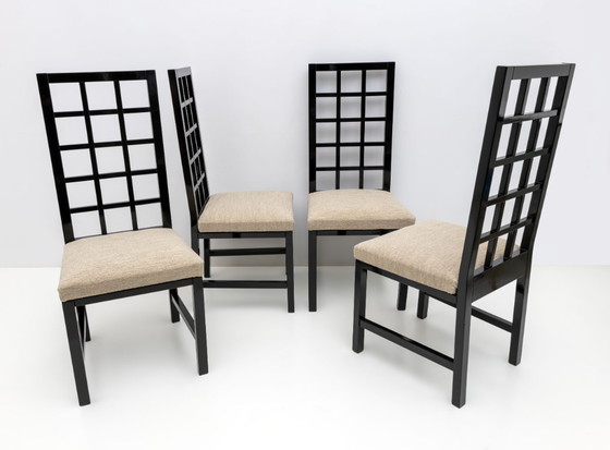 Vier Mackintosh-stijlen zwart gelakte stoelen met hoge rug, 1979